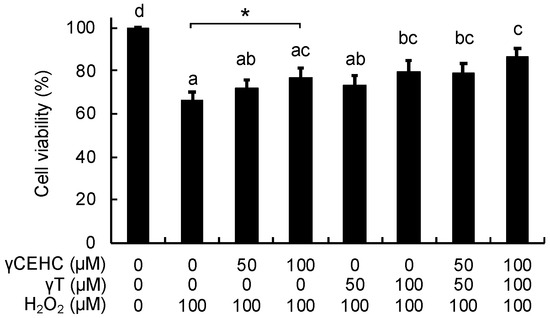 Cytoprotective effects of γCEHC and γT on the hydrogen peroxide-induced cytotoxicity of Hepa1c1c7 cells. The cells were pretreated with γCEHC and/or γT for 24 h, followed by exposure to hydrogen peroxide at 100 μM for 6 h. The cells were incubated with an MTT solution (0.5 mg/mL) for 2 h. The cell viability values are expressed as the percentages of the corresponding control. Values are the means ± S.D. (n = 4). * p < 0.05 vs. control. Different letters above the bars indicate significant differences among the treatments (p < 0.05).