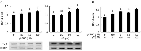 The modulating effects of γCEHC and γT on the HO-1 protein levels by each compound treatment (A) and the combination treatment (B). The confluent Hepa1c1c7 cells were treated with γCEHC and/or γT at the indicated concentrations for 24 h. The protein expression levels of HO-1 were determined by western blotting. The values are expressed as relative to the corresponding control. Values are the means ± S.D. (n = 3). Different letters above the bars indicate significant differences among the treatments (p < 0.05).