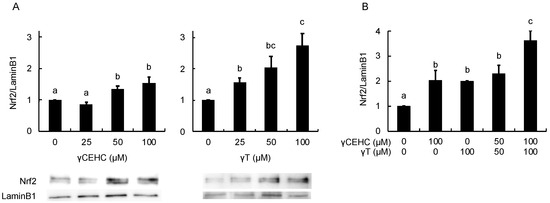 The modulating effects of γCEHC and γT on the nuclear translocation of the Nrf2 protein levels by each compound treatment (A) and the combination treatment (B). The confluent Hepa1c1c7 cells were treated with γCEHC and/or γT at the indicated concentrations for 24 h. The nuclear translocation of the Nrf2 protein was determined by western blotting. The values are expressed as relative to the corresponding control. Values are the means ± S.D. (n = 3). Different letters above the bars indicate significant differences among the treatments (p < 0.05).