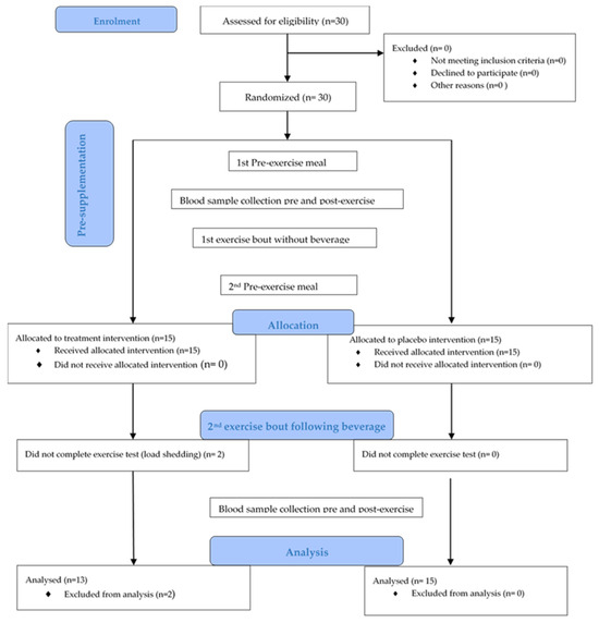 One hour before each exercise bout, participants received a standardized pre-exercise meal comprising four Weet-Bix™ biscuits, 400 mL full cream milk, and four drizzles of honey (2315 kJ, 73% carbohydrate, 19% protein, 8% fat). Supplementation was not administered before or during the first exercise bout. Heart rate, blood pressure, and blood samples were taken immediately before and after each exercise bout. Following the pre-exercise meal for the second exercise bout protocol, participants ingested the 500 mL L-arginine/L-citrulline treatment or placebo 40 min before the exercise test. Figure 1 represents the CONSORT study flow diagram [32].