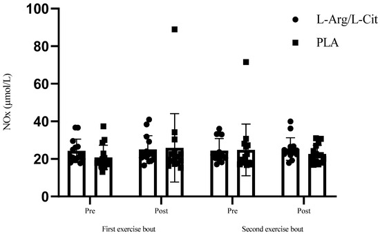 The L-arginine/L-citrulline treatment administered in this study was well tolerated by participants, with no adverse side effects reported. The analysis excluded two participants from the L-arginine/L-citrulline group who did not complete the study protocol. Plasma NOx concentrations of the two exercise bouts, pre and post the exercise incremental running to exhaustion test, are shown in Figure 2. There was no significant effect of time on NOx levels across the four time points, F(1.873, 50.6573) = 0.755, (p > 0.05). Additionally, the interaction between the time and treatment was not significant, (p > 0.05). There were no significant differences between the L-arginine/L-citrulline and placebo groups in the first exercise bout, pre-exercise (24.31 ± 6.24 vs. 20.83 ± 6.46 µmol/L), post-exercise (25.02 ± 7.37 vs. 25.90 ± 18.17 µmol/L), p > 0.05; and the second exercise bout, pre-exercise (24.41 ± 6.48 vs. 24.77 ± 13.72 µmol/L), post-exercise (25.29 ± 5.96 vs. 22.58 ± 4.74 µmol/L), p > 0.05. However, following the second exercise bout, plasma NOx concentration increased by 3.6% for the L-arginine/L-citrulline group, whereas it decreased by 8.8% with placebo. However, this was not significant (p > 0.05).