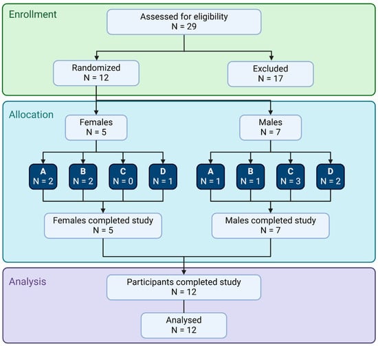 This clinical trial was conducted using a randomized, double-blinded, cross-over study design (NCT04463030); conducted in accordance with the Declaration of Helsinki; and approved by the Argus Independent Review Board, Tucson, AZ, USA. Clinic and lab work was performed at NIS Labs in Klamath Falls, OR, USA. Individuals from the study site’s database, who had previously expressed interest in participating in clinical studies were contacted to update their health information, and those demonstrating interest were then invited for a screening process. Out of twenty-nine individuals screened, nine did not meet the inclusion/exclusion profile, and eight were not interested in participation. Twelve participants were enrolled after providing written consent and completed the study (Figure 1, Table 1).