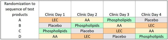 All participants received all four test products on different clinic visits. The participants were randomized to receive the test products in different sequences of liposome-encapsulated vitamin C (LEC), a matching dose of conventional ascorbic acid (AA), phospholipids (the liposome-encapsulation material), or placebo one week apart (Figure 2). The principal investigator generated the random allocation sequence without knowing which participant would be assigned to which sequence. Clinic staff enrolled participants; the scheduling of each person determined the allocation to sequence. All clinic staff were blinded.