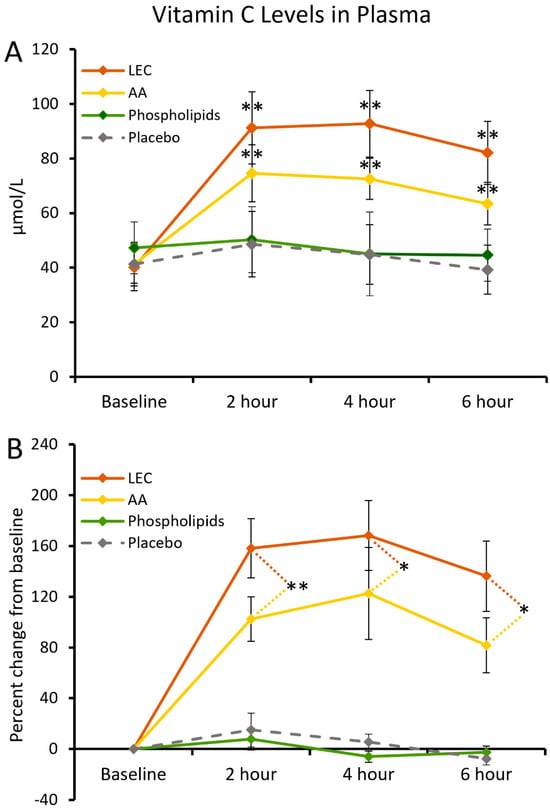 Vitamin C levels in plasma. Data are shown as the averages ± standard error of the mean at baseline, 2 h, 4 h, and 6 h after consuming either liposome-encapsulated vitamin C (LEC), ascorbic acid (AA), the phospholipids used for the liposomal material, or placebo. Levels of statistical significance when compared to baseline levels (A) or to another test product at the same timepoint (B) are shown on the graphs, where p < 0.05: * and p < 0.01: **. (A) Vitamin C levels in micromole/liter (µM/L) blood plasma: Vitamin C levels increased after consuming both LEC and AA. The increased levels were highly significant following the consumption of both LEC and AA at all timepoints, compared to baseline. In contrast, the plasma levels of vitamin C did not change after consuming phospholipids or placebo. (B) The percent change from baseline for plasma vitamin C levels. The increase in blood plasma levels of vitamin C was higher after consuming LEC compared to AA. The higher level of plasma vitamin C after consuming LEC was highly significant at 2 h when compared to AA and statistically significant when compared to AA at both 4 and 6 h.