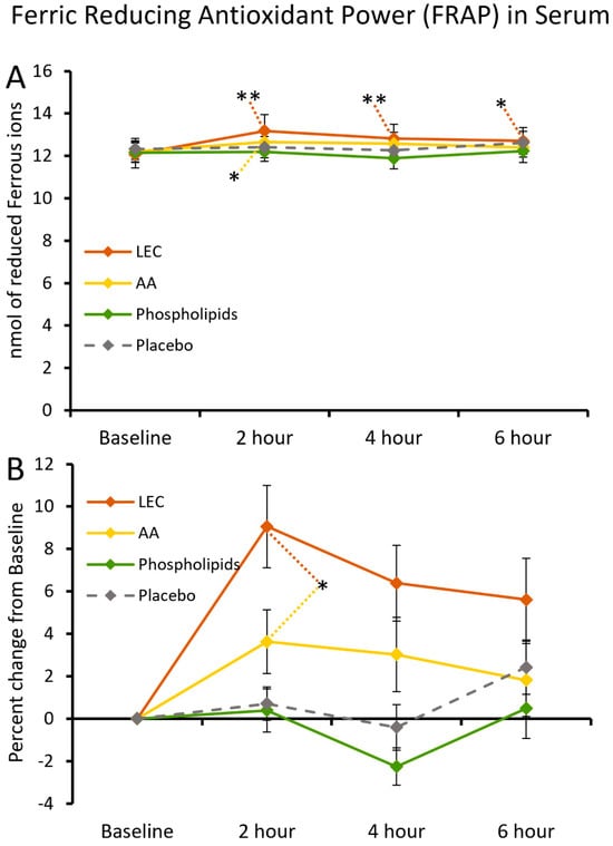 The ferric-reducing antioxidant power (FRAP) showed rapid increases after consumption of both LEC and AA (Figure 5). The antioxidant power was higher after consuming LEC; this increase was highly significant at the 2 and 4 h timepoints (p < 0.01, Figure 5A) and significant at the 6 h timepoint (p < 0.05, Figure 5A) when compared to baseline. Consumption of AA also significantly increased the antioxidant capacity but only at the 2 h timepoint (p < 0.05, Figure 5B). At 2 h, the higher antioxidant power seen after consuming LEC was significantly higher than after consuming AA. Neither consumption of phospholipids nor placebo were associated with changes to the serum antioxidant power in the FRAP assay.