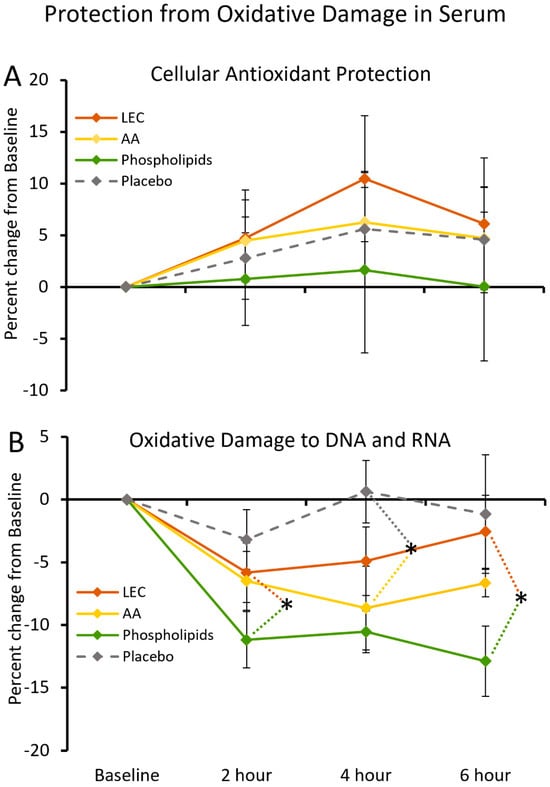 Functional antioxidant protection by serum. Levels of statistical significance when compared to another test product at the same timepoint are shown on the graphs, where p < 0.05: *. (A) Cellular antioxidant protection measured by the Cellular Antioxidant Protection of erythrocytes (CAP-e) assay. Data are shown as the averages ± standard error of the mean at baseline, 2 h, 4 h, and 6 h after consuming either liposome-encapsulated vitamin C (LEC), ascorbic acid (AA), the phospholipids used for the liposomal material, or placebo. The percent change from baseline is shown for cellular antioxidant protection. The increase in cellular antioxidant protection was highest after consuming LEC, peaking at 4 h. The increase in cellular antioxidant protection after consuming LEC was not statistically significant when compared to the other test product. (B) Oxidative damage to serum DNA/RNA measured using the 8-OHdG marker. Oxidative damage to DNA/RNA decreased after consuming phospholipids, LEC, and AA. The decrease in DNA/RNA oxidative damage was significantly more robust after consuming phospholipids than LEC at 2 and 6 h. Oxidative damage was not different from baseline after consuming placebo. Levels of statistical significance are shown in the graphs and were p < 0.05: *.