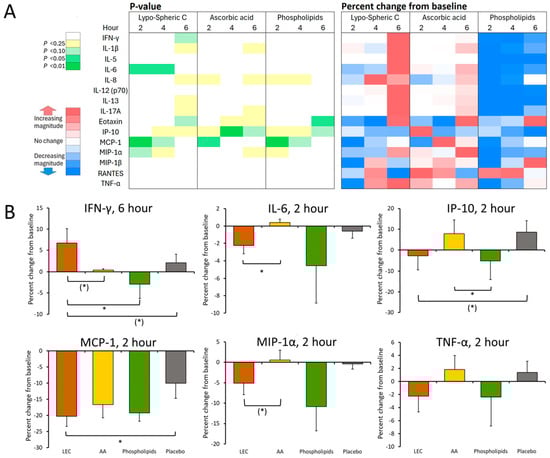 Serum cytokine levels. (A): Heat maps showing the percent changes from baseline after consuming liposome-encapsulated vitamin C (LEC), ascorbic acid (AA), or the phospholipids used for the liposomal material. The left panel shows the levels of statistical significance, and the right panel shows the magnitudes of the increased versus decreased levels of cytokines. (B): The percent change is shown as the averages ± standard error of the mean at 2 h for IL-6, IP-10, MCP-1, MIP-1α, and TNF-α, and 6 h for IFN-y, after consuming either liposome-encapsulated vitamin C (LEC), ascorbic acid (AA), the phospholipids used for the liposomal material, or placebo. Levels of statistical significance when comparing the changes after consuming the different test products are shown on the graphs, where p < 0.1: (*) and p < 0.05: *.