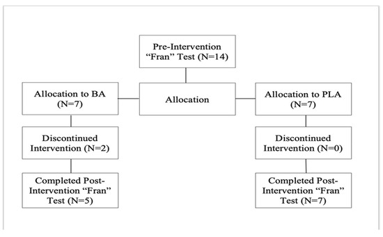 Participant flow through the study is shown in Figure 2. Fourteen participants were initially enrolled in the study (N = 7 BA; N = 7 PLA). However, 12 (N = 5 BA; N = 7 PLA; five females, seven males) participants completed the entire protocol and were included in the data analysis. Two participants did not complete the post-intervention test, one due to a shoulder injury unrelated to the testing protocol, and the other reported negative side effects (facial acne) considered to be “likely” associated with the BA intervention. Characteristics of participants who completed the study are outlined in Table 1. There were no differences between groups for any of these characteristics (p > 0.05).