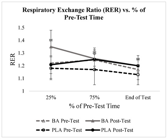 There was a significant “group” × “time during the session” × “time during the intervention” interaction for RER (p = 0.021), outlined in Figure 3. Post-hoc tests indicated RER was significantly higher in the BA group during the post-test compared to the pre-test at the 25% time point (p < 0.01), but not at the 75% time point (p = 0.76) or the end of the test (p = 0.32). RER was significantly higher in the PLA group during the post-test compared to the pre-test at the 75% time point (p < 0.01) and the end of the test (p = 0.011), but not at the 25% time point (p = 0.35).