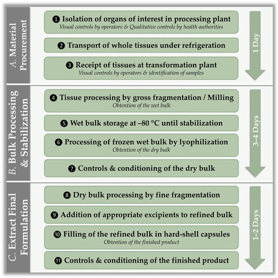 In order to obtain a fine homogeneous powder for finished product formulation, the dry bulk materials were fragmented (i.e., by hand crushing or by automatic mincing; Thermomix, Vorwerk, Wuppertal, Germany) to attain approximate cubic dimensions of <0.5 mm3. Once the finely fragmented dry bulk was obtained, the filling mix was prepared. The filling mix comprised a single organ in fragmented dry bulk form, supplemented with mannitol if necessary. The use of an appropriate capsule size (e.g., transparent size 0 gelatin capsules, 0.68 mL body capacity) enabled the formulation of 300 mg of extract per administration unit. The filling mix was then distributed in the hard-shell capsules using a semi-automatic capsule filler. The obtained capsules were then conditioned in sealed clear glass containers and were stored at ambient temperature until further use. Appropriate controls and acceptance criteria were specified for the finished product form. A structured overview of the established biomaterial procurement, preparation, lyophilization, and formulation process is presented in Figure 1.