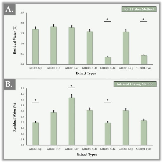Quantitative results of finished product residual moisture level measurements. (A) Results obtained with the Karl Fisher titration method. (B) Results obtained with the infrared drying method. Results that were found to be statistically significantly different (i.e., p-value < 0.05) from the intergroup average are identified with an asterisk (*).