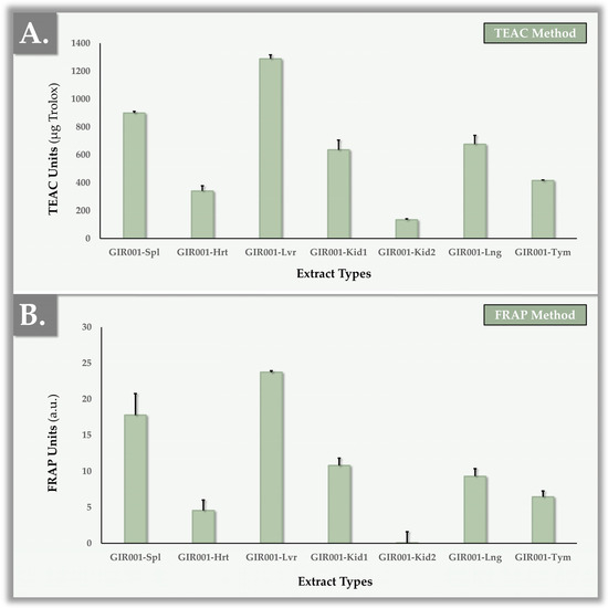 Specifically, it was determined that all of the extracts exhibited a positive modification of the complex viscosity of the system, as measured following parallel sample incubation (Figure 4). This behavior probably resulted from a direct antioxidant action of the extracts, as well as a structural polymeric network modification (i.e., a form of polymer cross-linking) by the components of the extracts under the action of H2O2. Overall, these results were indicative that the extracts presented intrinsic antioxidant properties and significant reactivity in the presence of an oxidant source and an available biomacromolecule (Figure 3 and Figure 4). Such results were interpreted positively, as they suggested that the considered extracts were able to protect and interact with biomacromolecules in the presence of strong oxidative stress via a complex mode of action. Specifically, similar patterns (i.e., with regard to relative function) were evidenced between the TEAC, FRAP, and oxidative challenge assay results (e.g., the GIR001-Lvr extracts were the most active and the GIR001-Kid2 extracts were the least active; Figure 3 and Figure 4). Importantly, it should be noted that the GIR001-Lvr sample was diluted before analysis, as the sample presented excessive activity at the same concentration as the other samples (Figure 4). Overall, the various functional investigations identified the liver-based extract (i.e., GIR001-Lvr sample) as being the most active, based on comparative antioxidant activity benchmarking assays (Figure 3 and Figure 4).