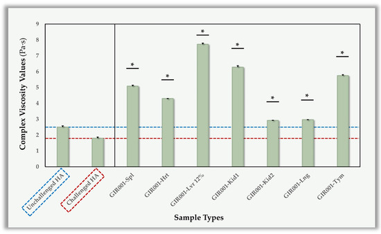 Results of endpoint complex viscosity values of hydrogel systems in an oxidative challenge assay. The extracts were used to assess protective or rescue effects in undiluted form, except for the GIR001-Lvr extract, which was used at 12% concentration to fall within the experimental limits of detection. Results that were found to be statistically significantly different (i.e., p-value < 0.05) from the challenged HA group are identified with an asterisk (*). HA, hyaluronic acid.