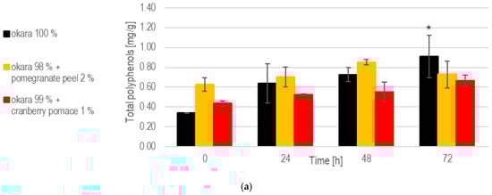 While the enriched fermentations initially provided higher polyphenol contents, the 100% okara formulation showed a more consistent release of polyphenols over time (Figure 9). Notably, at 72 h, the 100% okara fermentations showed a significant (p < 0.05) increase compared to the initial concentrations at 0 h, reaching 0.908 mg/g. This was the highest value among all fermentations. The total polyphenol content in the 1% cranberry substrate attained 0.667 mg/g at 72 h, indicating that this SSF setup effectively enhances polyphenols’ release.