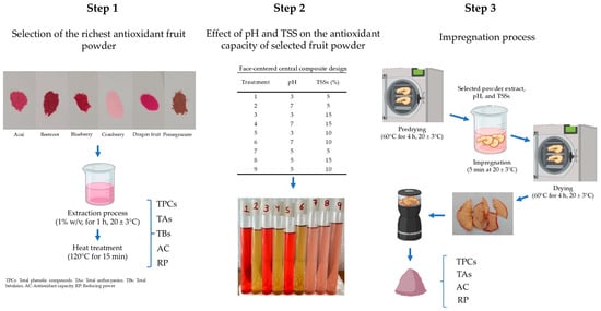 The present study was conducted in three steps (Figure 1): Step (1) Selection of the richest antioxidant powder fruit extract. Step (2) Evaluation of the effect of pH and TSSs on the stability of bioactive compounds and antioxidant capacity of the richest antioxidant fruit powder extract. Step (3) Impregnation of the bioactive compounds from the extracts with the highest antioxidant properties into apple slices.