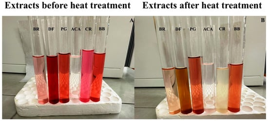 Color stability of the extract obtained from antioxidant-rich powders before (A) and after (B) heat treatment. BR: beetroot, DF: dragon fruit, PG: pomegranate, ACA: acaí, CR: cranberry, and BB: blueberry.