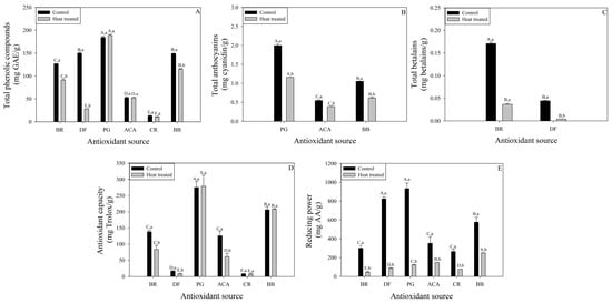 The bioactive compounds and antioxidant capacity of the rich antioxidant powders before (black bars) and after (gray bars) the sterilization process (120 °C for 15 min). BR: beetroot, DF: dragon fruit, PG: pomegranate, ACA: acaí, CR: cranberry, and BB: blueberry. The total phenolic compounds (A), total anthocyanins (B), total betalains (C), antioxidant capacity (D), and reducing power (E). Different letters of a and b indicate statistical differences (p < 0.05) between the treated and nontreated extracts. Different letters of A, B, C, … indicate statistical differences (p < 0.05) among the extracts. Bars indicate standard deviation.