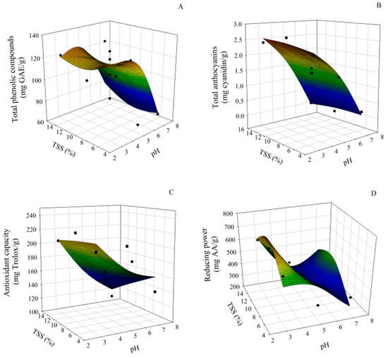 The effect of pH and total soluble solids (°Brix) on the bioactive compounds and antioxidant capacity of pomegranate powder. Dots indicate experimental data. The mesh represents adjusted data to the response surface model. Total phenolic compounds (A), total anthocyanins (B), antioxidant capacity (C), and reducing power (D).