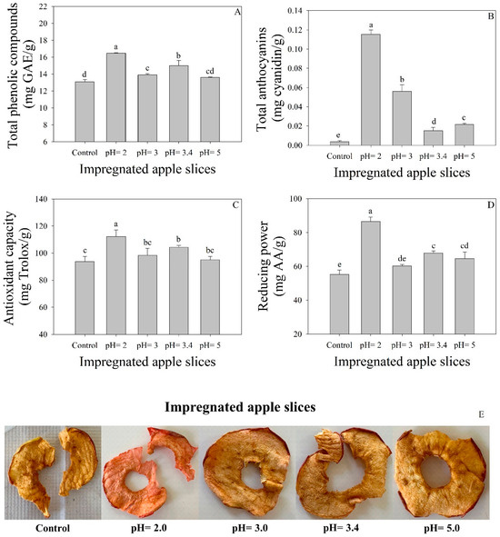The bioactive compounds and antioxidant capacity of the apple slices impregnated (5 min at 20 ± 3 °C) with pomegranate extracts obtained at different pH values. The total phenolic compounds (A), total anthocyanins (B), antioxidant capacity (C), and reducing power (D) of the impregnated apple slices after the drying process (E). Different letters a, b, c, … indicate statistical differences (p < 0.05). Bars indicate standard deviation.