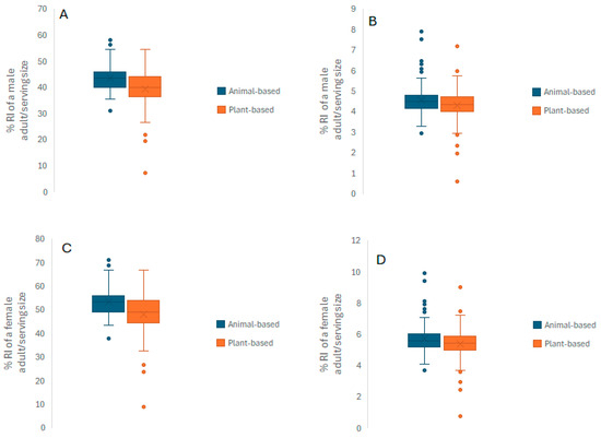 Energy and protein content of animal- and plant-based protein powders. Data are expressed as % reference intake of protein (A–C) and energy (B–D) per serving size. Data is calculated based on Nutrient Reference Values (NRVs) of 55 g protein and 2500 kcal energy for an adult male and of 45 g protein and 2000 kcal energy for an adult female [24]. Medians are outlined with an X.
