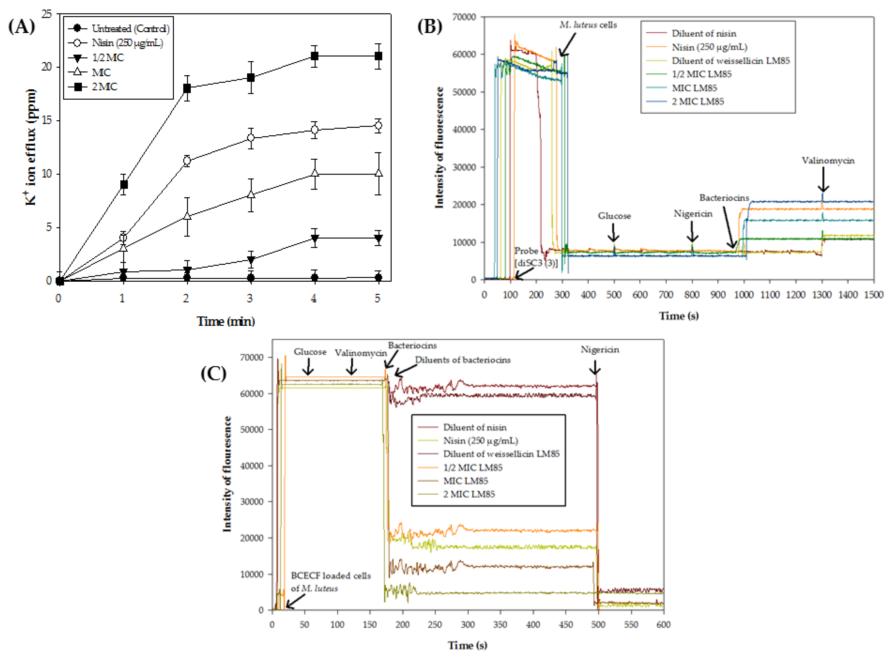 - Yadav, M.K.; Tiwari, S.K. Weissellicin LM85 purified from Weissella confusa LM85 effluxes potassium ions and depletes proton motive force in Escherichia coli ATCC 25922. Int. J. Pept. Res. Ther. 2024, 30, 44. [Google Scholar] [CrossRef]