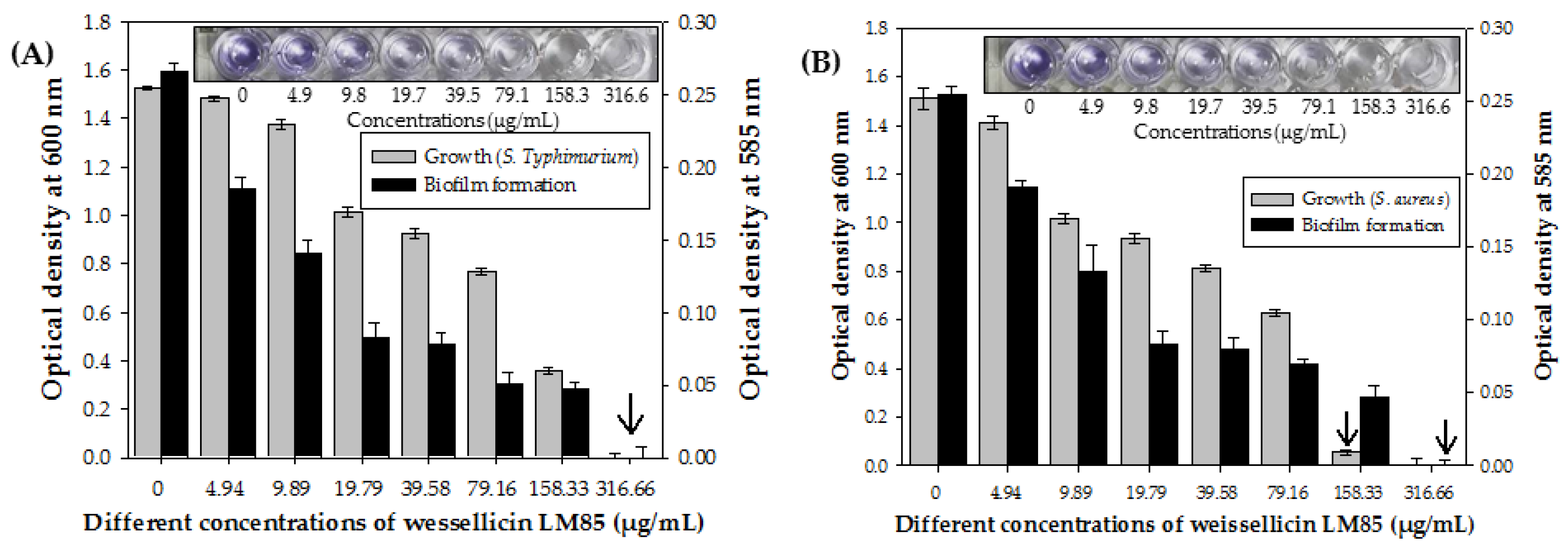 3.8. Inhibition of Growth and Biofilm Formation of S. Typhimurium ATCC13311 and S. aureus ATCC 25923
