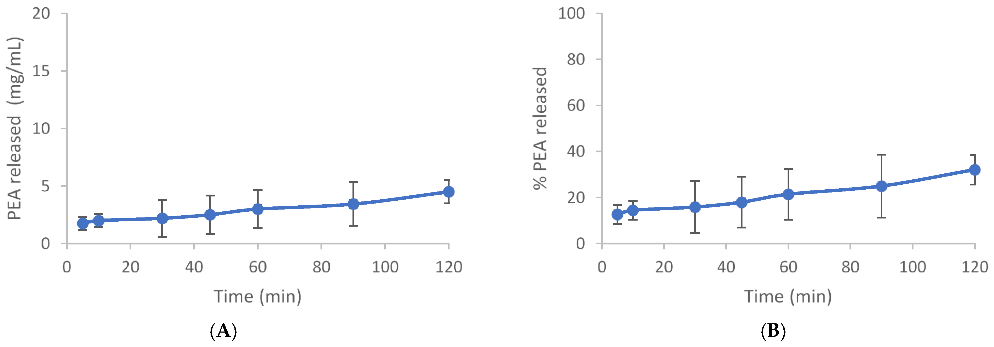 Time (min.) | PEA (mg/mL) | SD |