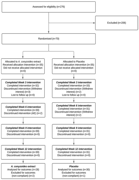 Seventy participants (25 male, 45 female) with clinically diagnosed osteoarthritis were randomized (Figure 1). Twelve participants withdrew during the study, leaving 58 who completed the trial and were included in the final analysis (A. conyzoides n = 28 and placebo n = 30). Of the withdrawals, three participants (A. conyzoides n = 2 and placebo n = 1) reported adverse events, none of which were related to the study product. Baseline demographic and anthropometric characteristics were comparable between groups, with no statistical differences observed (Table 1).
