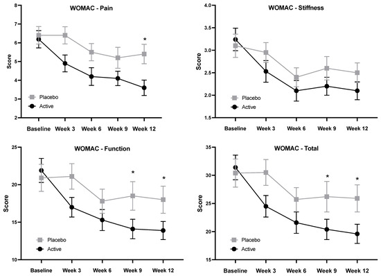 Change in Womac pain, stiffness, function and total scores over 12 weeks. * significant difference between groups; p < 0.05.