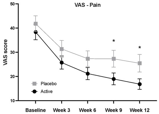 VAS results were consistent with WOMAC findings, showing significantly lower pain scores in the A. conyzoides group at weeks 9 and 12 compared to placebo (p < 0.05) (Figure 3, Table 3).