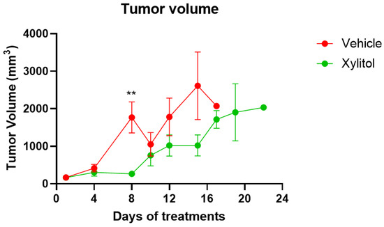 Tumor Volumes on Days of Treatment. The tumor volumes in the control (vehicle) and xylitol groups values are presented as +/− the Standard Error of the Means. t-test statistical analysis was used to compare tumor volumes between groups on the same day. No statistical difference is noted on Day 10. However, on Day 8, the difference in volumes was significant, with a p-value < 0.01 (**).