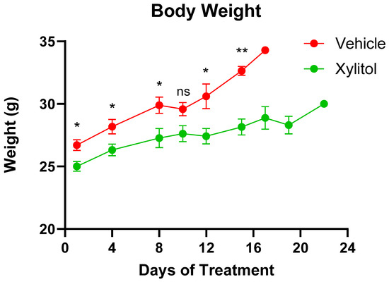 Animal Weights. Animal weights in the Control (Vehicle) and Xylitol groups are presented as mean ± SEM. A t-test was performed to compare the average weight between the groups on the same day. A p-value < 0.05 is denoted with (*), p-value < 0.01 is denoted with (**), and “ns” indicates no significant differences. There is no significant difference on Day 10.