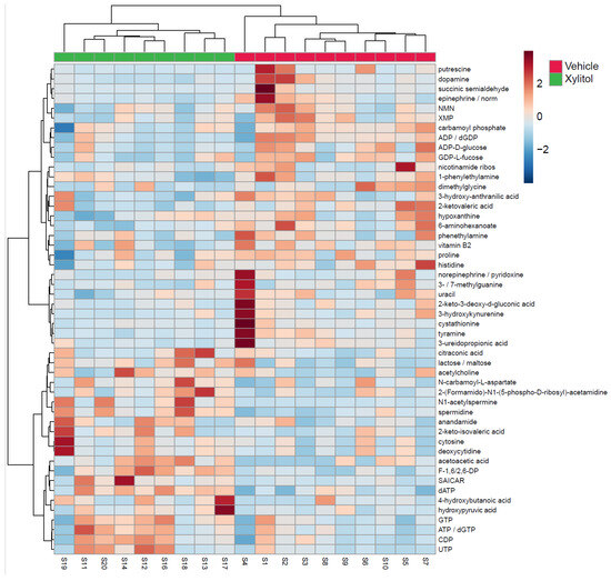 The metabolomic analysis heatmap (Figure 4) demonstrated that xylitol reduced the tumor production of histidine, acetylcholine, GTP, ATP/dGTP, and UDP, possibly impacting the host’s immune response to tumor cells by reactive oxygen species production [40]. Significant differences existed between the xylitol and control groups. Note that proline, NMN, and XMP increase with the vehicle group. Additionally, the xylitol group exhibited decreases in dopamine, epinephrine, and putrescine levels compared to the control group. The results of the statistical analysis (t-test) comparing the control to the xylitol groups are shown in Table 1. Xylitol significantly increases dATP, ATP/dGTP, CDP, SAICAR, acetoacetic acid, N1-acetylspermine, F-1, 6/2, 6-DP, and spermidine metabolites in the tumor compared to the saline control.
