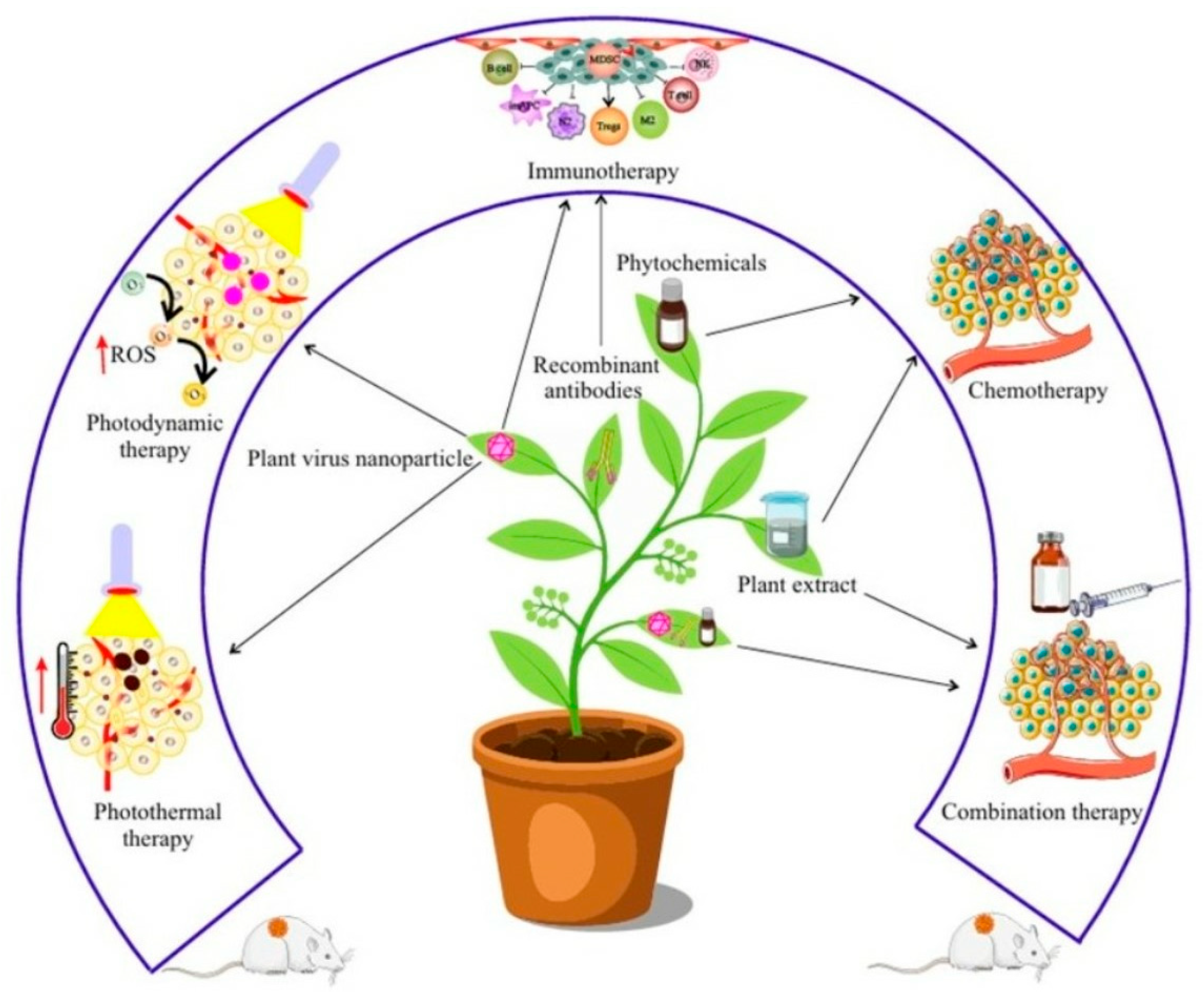 - Oncolytic viruses are gaining significant clinical value due to their effectiveness against cancer. Plant viruses, specifically, cannot infect mammalian cells, eliminating the infection-related drawbacks seen with other viral therapies. This makes them a valuable tool for manipulating tumors and inducing anti-tumor immunity [280,281]. Rather than directly replicating in or destroying cancer cells, plant virus nanoparticles (PVNPs) represent a novel class of immunostimulatory agents [281]. There are two main types of PVNPs: viral nanoparticles (VNPs), which are whole viruses with both a coat protein and internal nucleic acid, and virus-like particles (VLPs), which consist solely of the coat protein [282,283,284]. VLPs are genome-free versions of VNPs; they cannot replicate in plants and closely resemble the native structure of plant viruses. Both VLPs and VNPs can act as immune adjuvants and delivery systems for tumor-specific antigens that the human immune system can recognize.