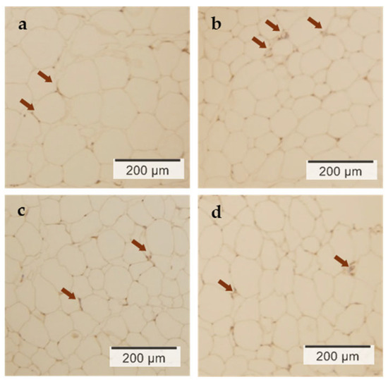 Immunostaining of UCP1 in epididymal adipose tissue. UCP1 expression was examined under a light microscope in epididymal adipose tissue. (a) HF group; (b) HFEx group; (c) HFC group; (d) HFCEx group. The arrows indicate some of the sites of UCP1 expression. HF: HF diet with no exercise; HFEx HF diet with exercise; HFC: HF diet with carnosine supplementation and with no exercise; HFCEx: HF diet with carnosine supplementation and with exercise.
