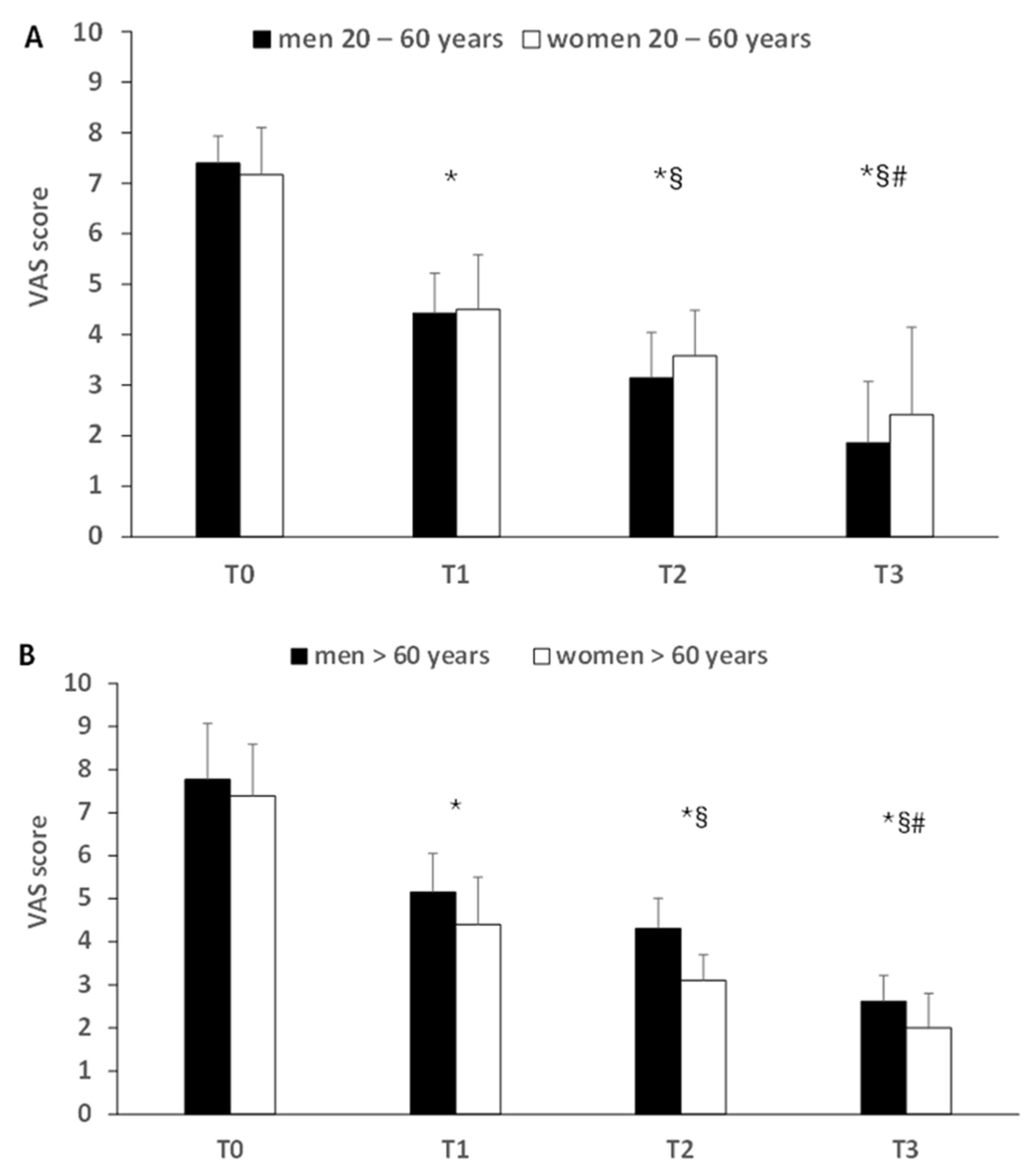 Figure 2. Time-dependent effect of nutraceutical treatment (T1: 1 month, T2: 2 months, T3: 3 months, after the beginning of fixed oral nutraceutical administration) on pain perception (evaluated through the Visual Analogue Scale, VAS) in enrolled men and women ((A) 20–60 years; (B) >60 years) with chronic knee OA. * p < 0.01 vs. T0; § p < 0.01 vs. T1; # p < 0.01 vs. T2 for both men and women.