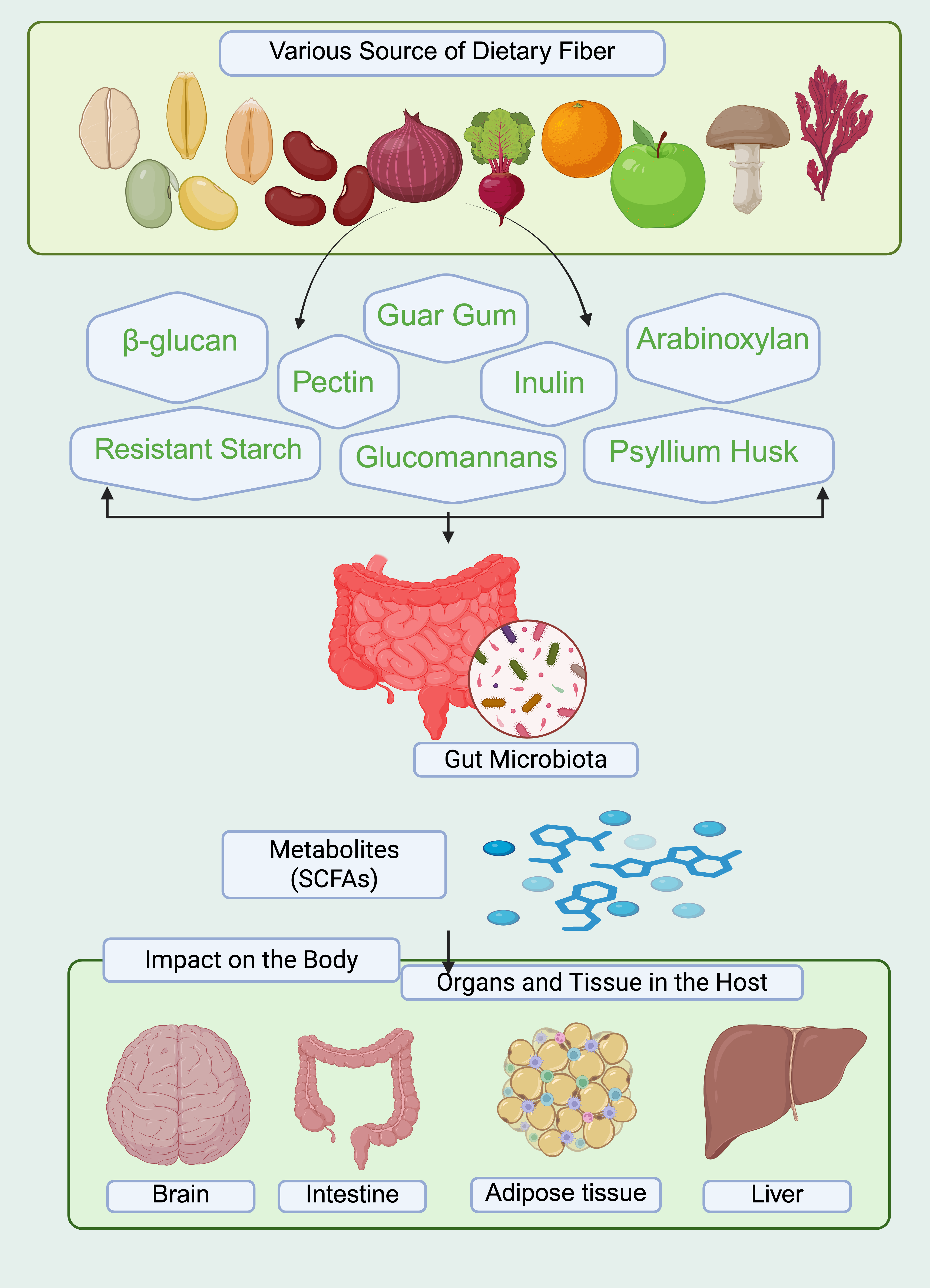 | Origin | Plant | Cellulose, Hemicellulose, Lignin, Pectin, Inulin, β-glucan, Resistant starch, Gums, Mucilage, Algal polysaccharides | [11,12] |