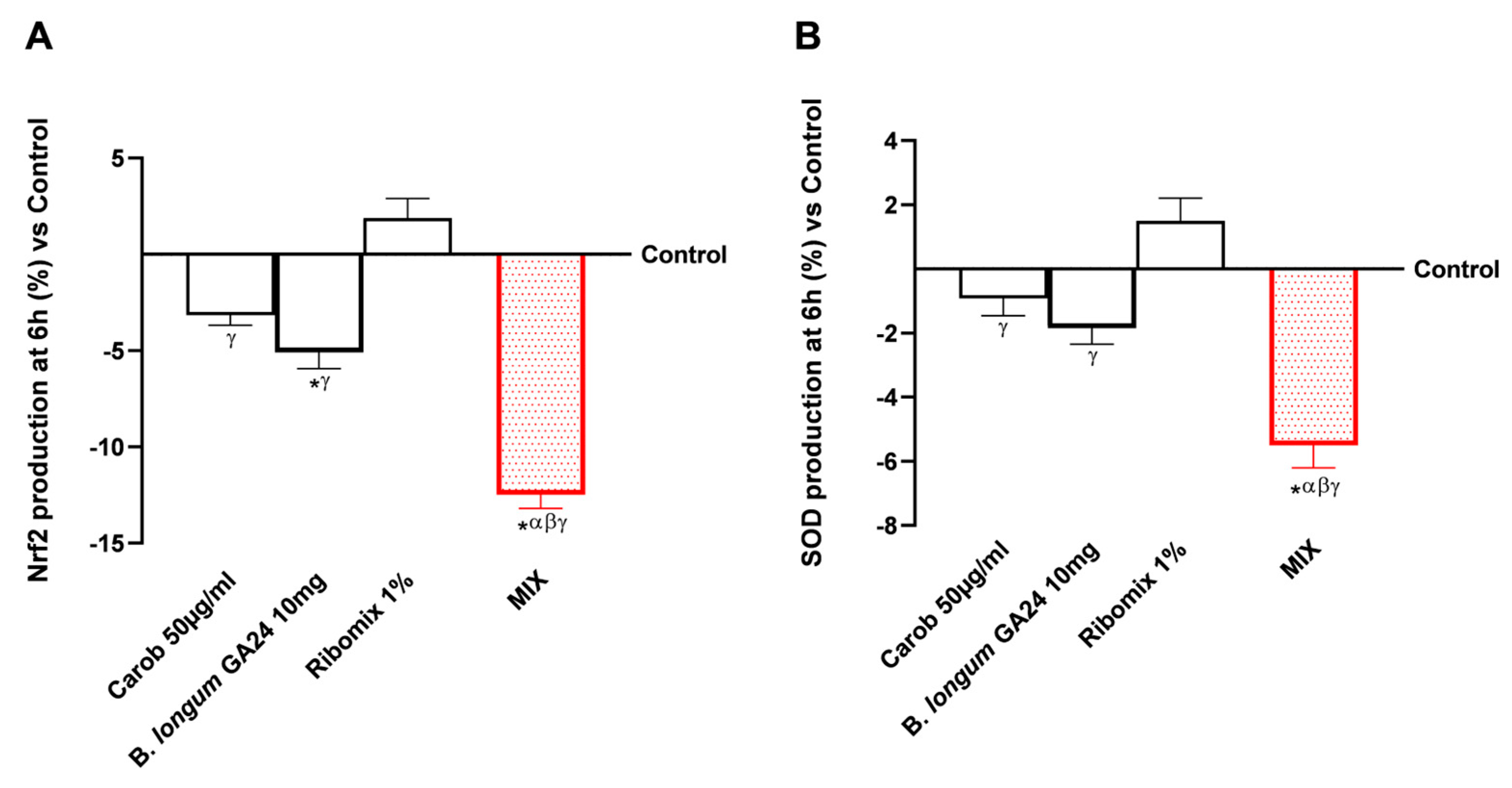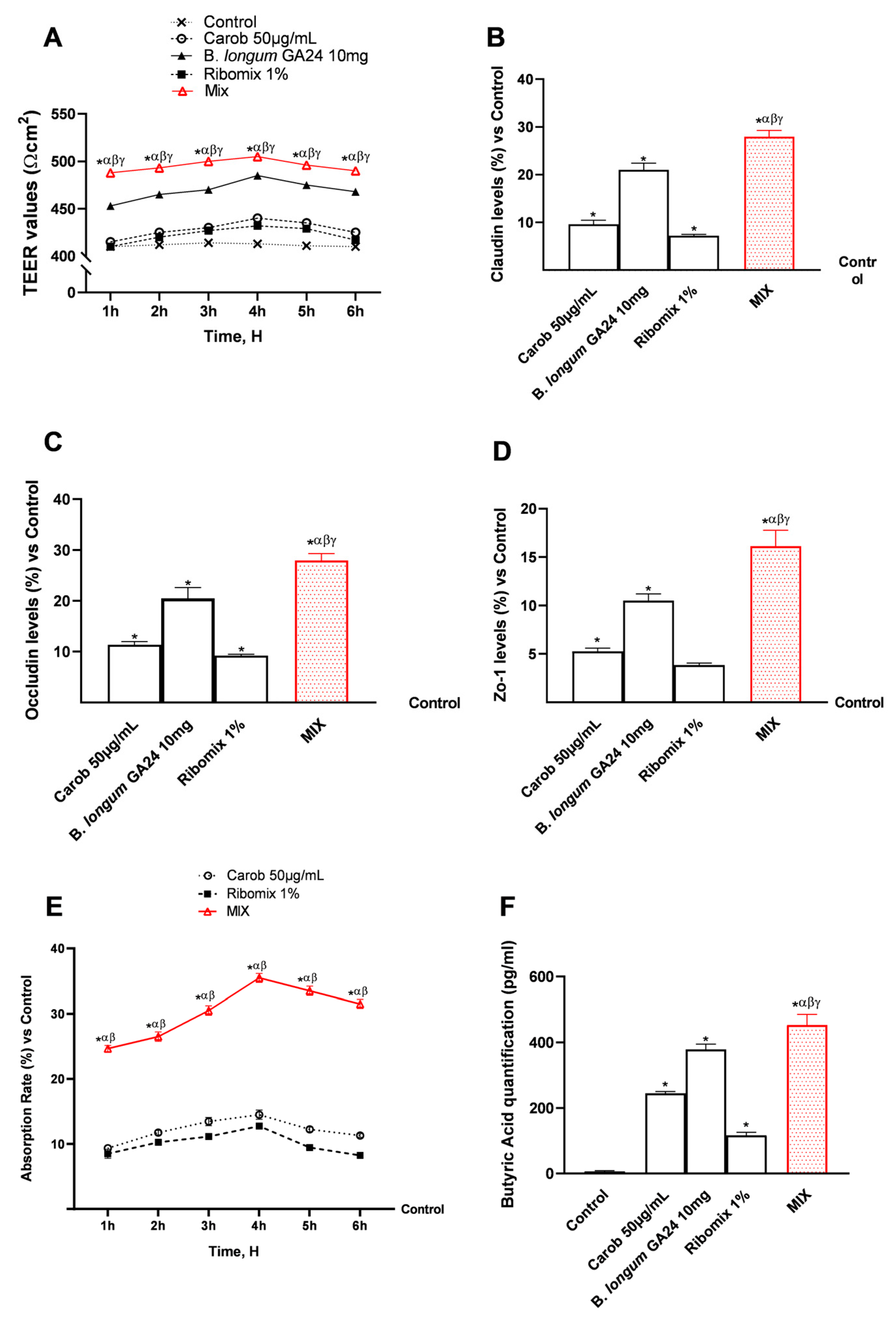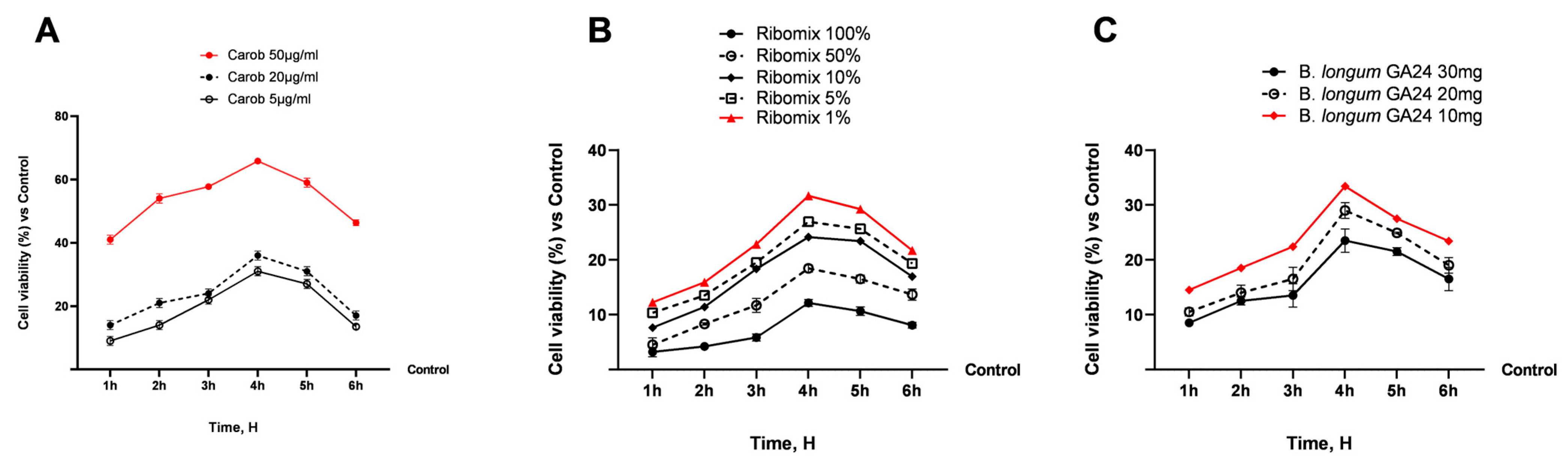 3.1. Safety Assessment of Various Concentrations of Carob, B. longum GA24, and Ribomix on Caco-2 Cells