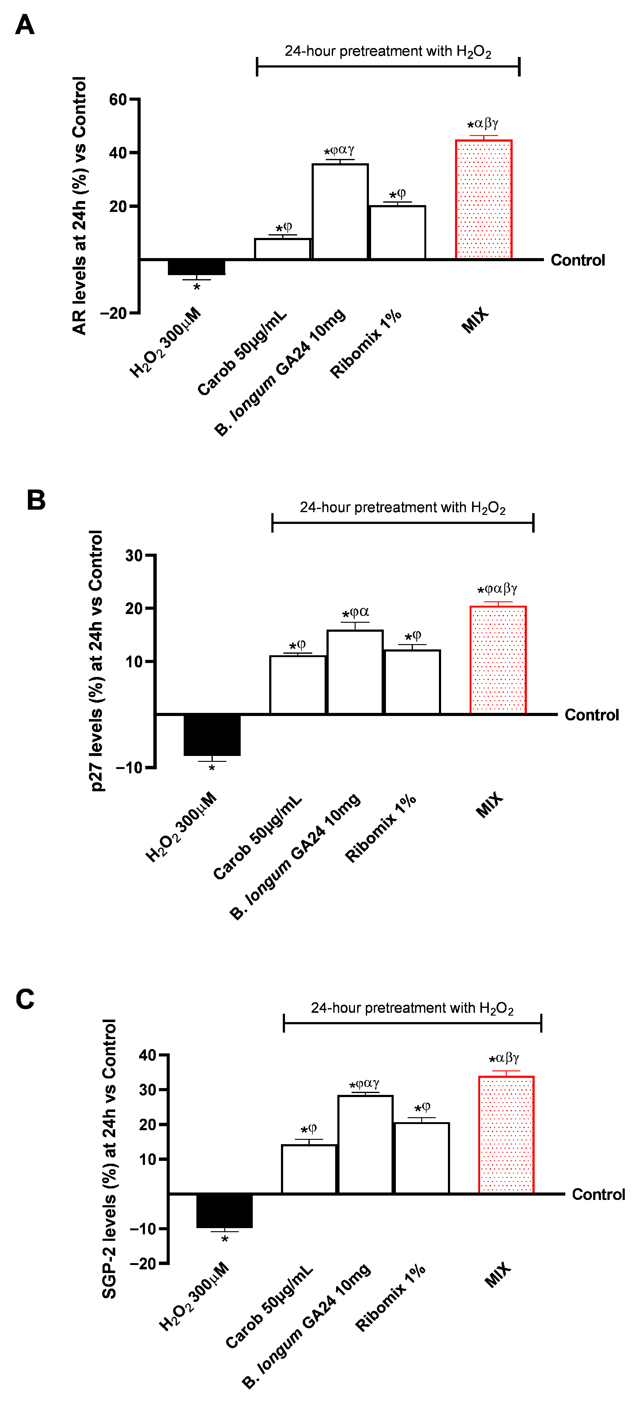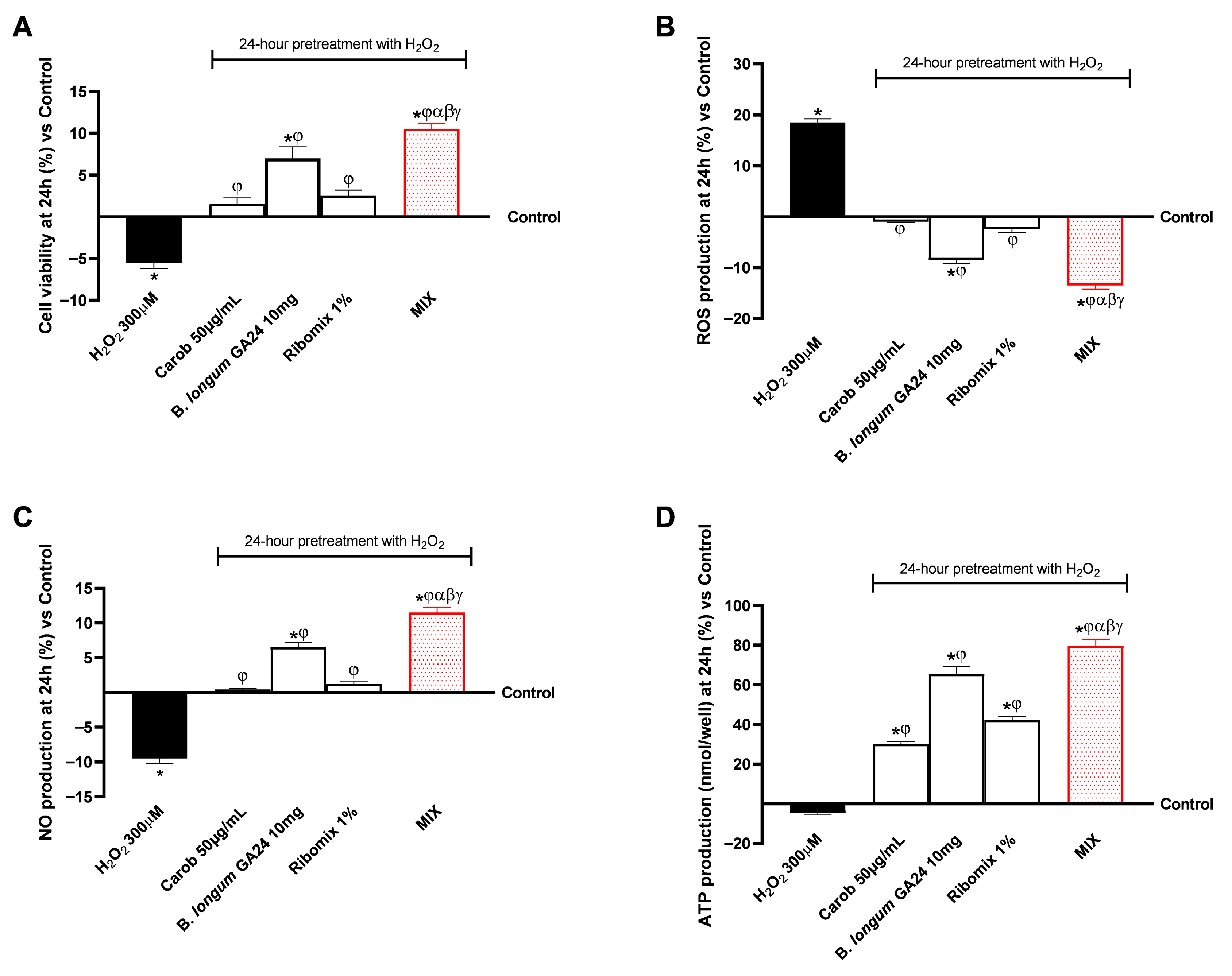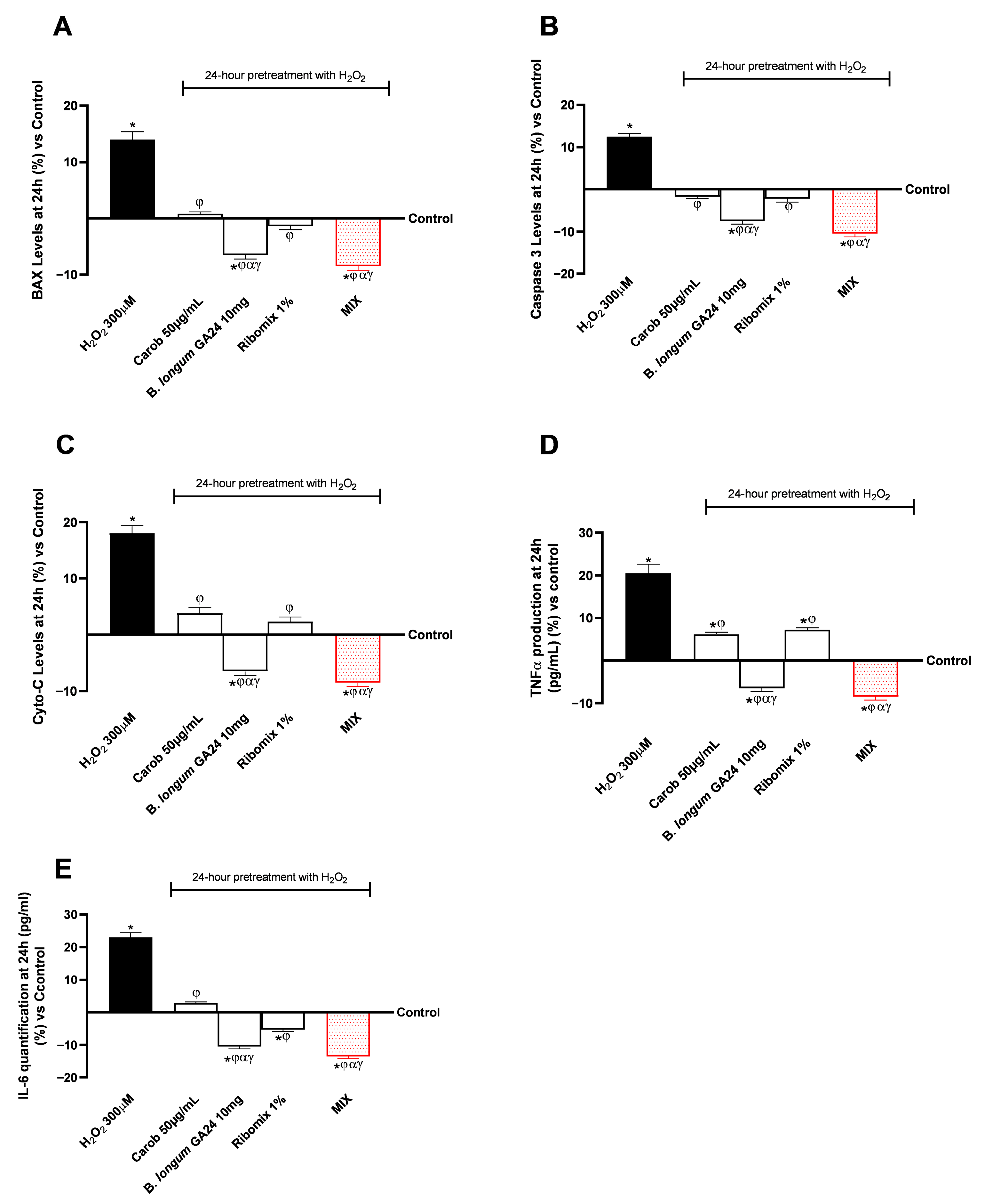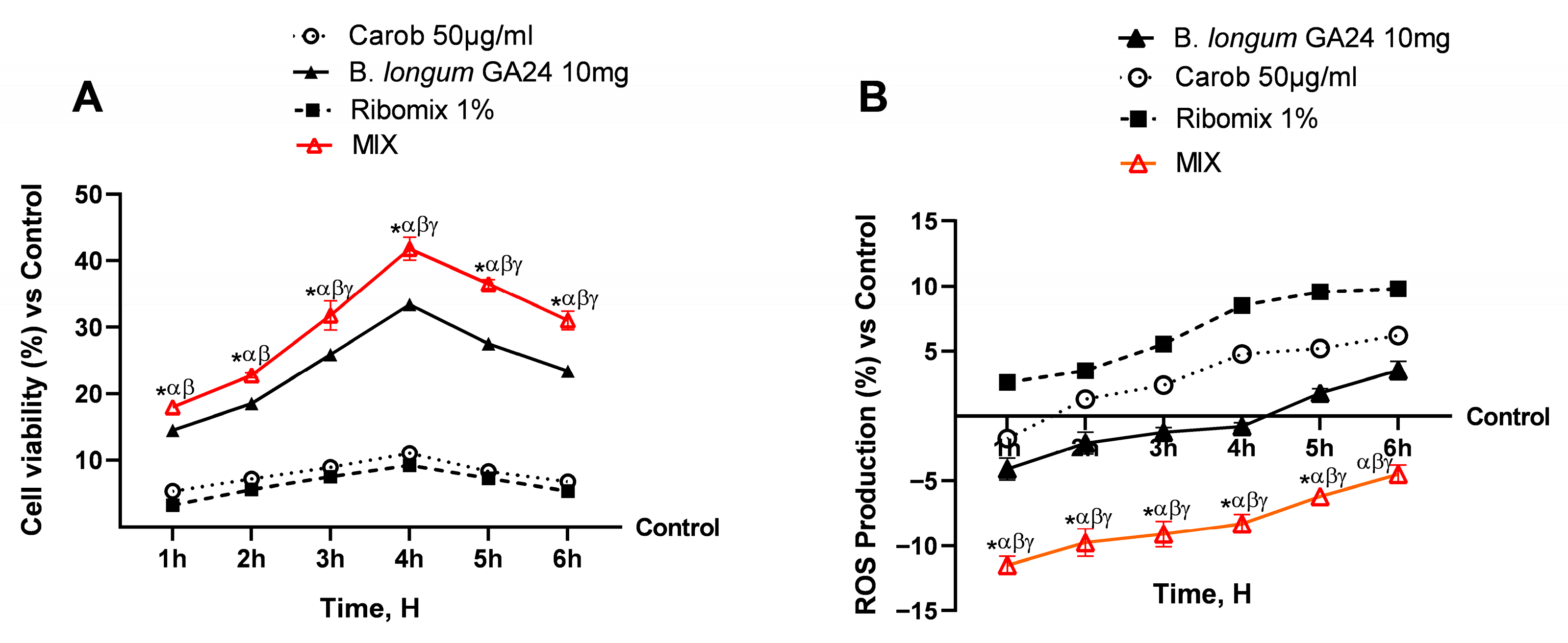 3.1. Safety Assessment of Various Concentrations of Carob, B. longum GA24, and Ribomix on Caco-2 Cells