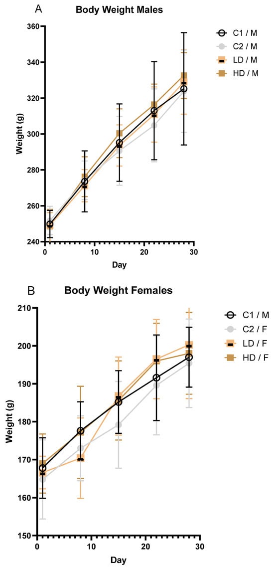 To investigate whether and how the exposure to the test item affects body weight over time in male and female rodents, body weights were recorded at regular intervals. Mean body weight increased steadily across all groups during the study. No toxicologically significant differences were observed between treated and control animals of either sex (Figure 2A,B).