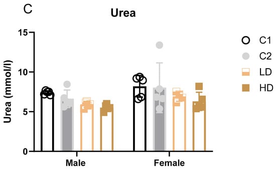 Renal markers: Males showed statistically significant decreases in both dose groups (LD: −20%; HD: −25%). One HD male value was below the historical range. Females showed a non-significant trend toward decreased urea levels (LD: −16%; HD: −23%). All individual values remained within historical limits, except for one animal in group C2 (considered incidental) (Figure 3C). Creatinine remained unchanged. The dose-dependent reduction in blood urea, in the absence of creatinine changes or renal pathology, may indicate physiological variation within normal adaptive limits.
