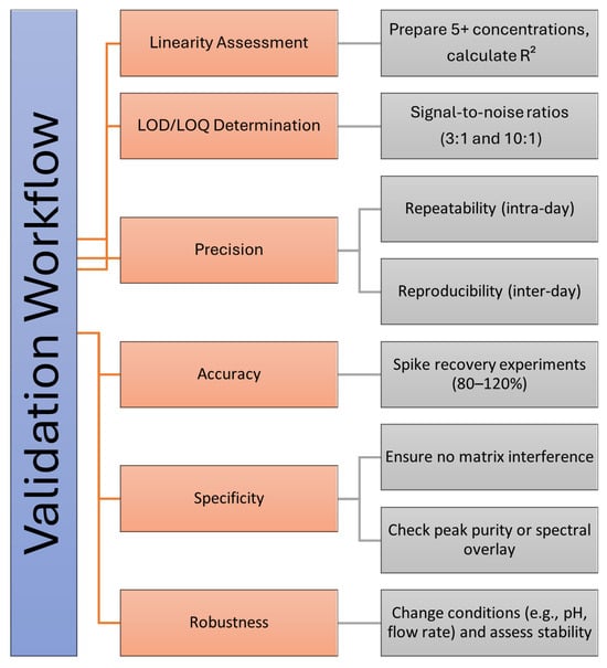 Validation workflow for analytical method assessment. The figure outlines key steps in the validation process, including linearity assessment, LOD/LOQ determination, precision (repeatability and reproducibility), accuracy (spike recovery experiments), specificity (matrix interference checks), and robustness (stability under varying conditions). Each step ensures the reliability and robustness of the analytical method.