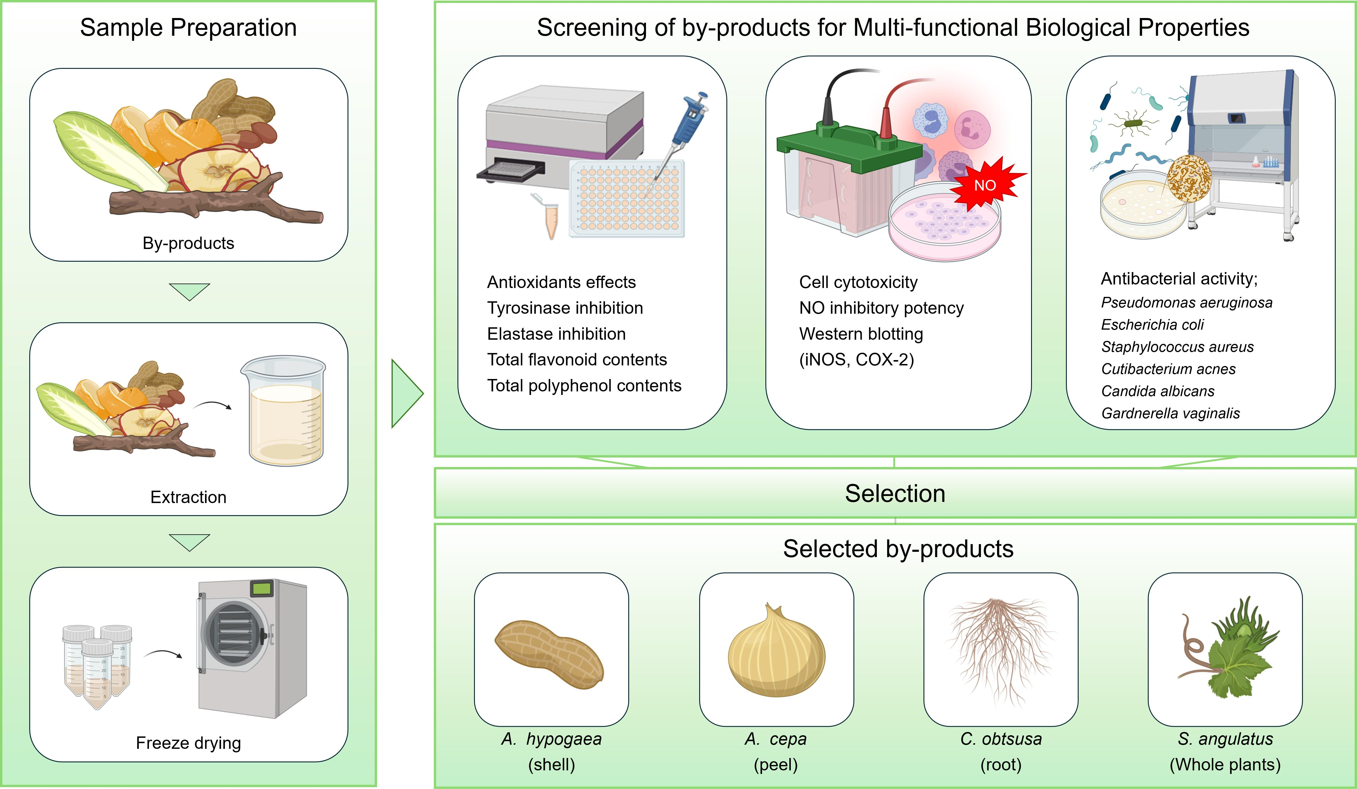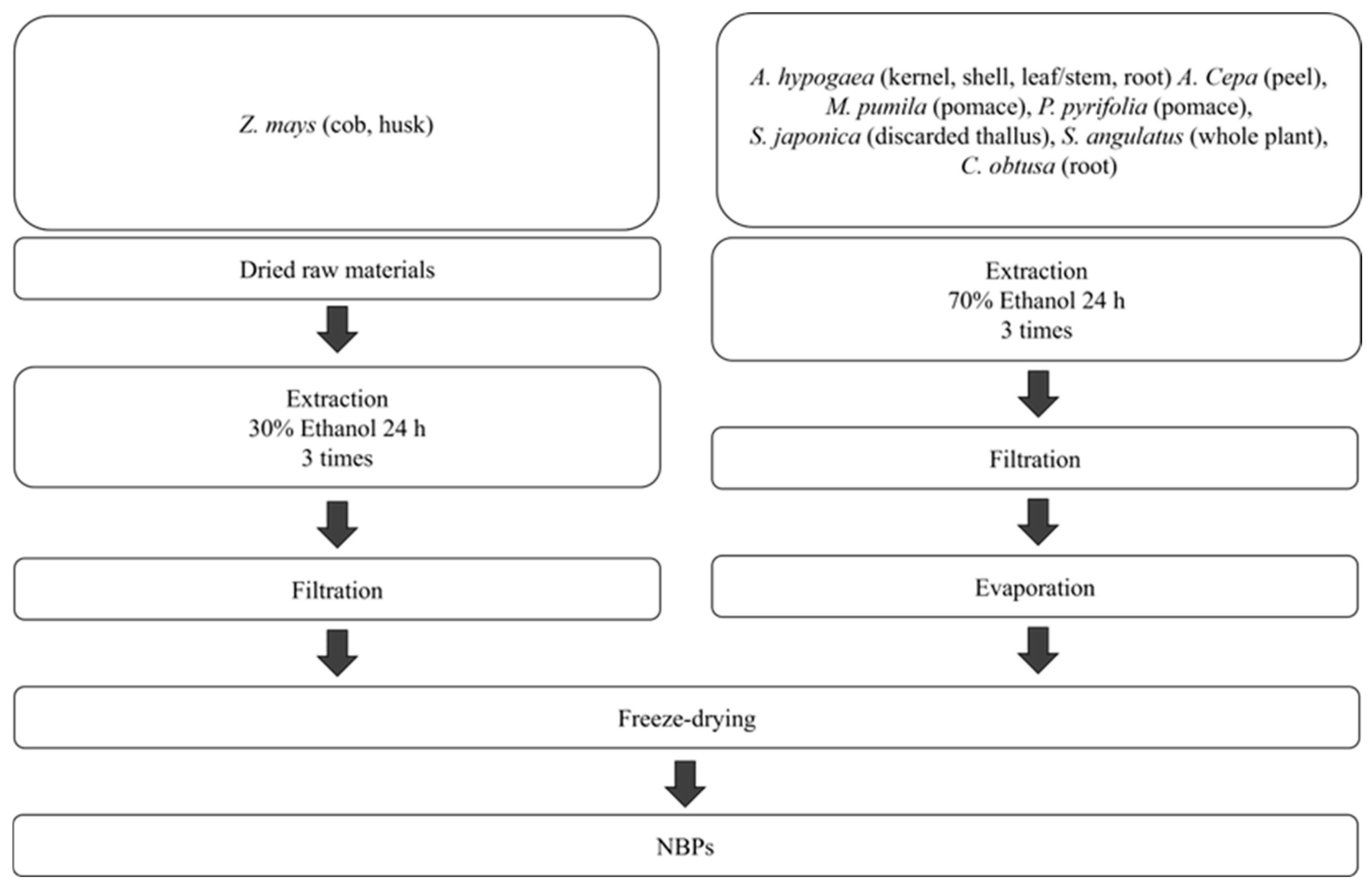 Plant and fruit materials used in this study included peanut (Arachis hypogaea L., A. hypogaea), apple (Malus pumila Mill., M. pumila), asian pear (Pyrus pyrifolia var. cultiva (Makino) Nakai, P. pyrifolia), brown seaweed (Saccharina japonica (Areschoug) C.E. Lane, C. Mayes, Druehl & G.W. Saunders, S. japonica), onion (Allium cepa L., A. cepa), purple corn (Zea mays L., Z. mays), bur cucumber (Sicyos angulatus L., S. angulatus), and hinoki cypress (Chamaecyparis obtusa (Siebold & Zucc.) Endl., C. obtusa). A. hypogaea was cultivated in Gumi, Gyeongsangbuk-do, and separated into roots, stems, kernels, and shells. M. pumila and P. pyrifolia were purchased from Geochang, Gyeongsangnam-do, and Ulju, Ulsan, respectively, and the pomace remaining after juice extraction was used. S. japonica was collected from Gijang, Busan. A. cepa was obtained from onions grown in Changnyeong, Gyeongsangnam-do, and the outer peels were separated for use. Z. mays purple corn was cultivated in Gochang, Jeonbuk-do, and the cobs and husks were separated. S. angulatus was collected from Chungju, Chungcheongbuk-do, and C. obtusa roots were obtained from cultivated trees in Dalseong, Daegu, and used in the study. All plant materials were botanically authenticated at the species level using the Species Korea database operated by the National Institute of Biological Resources under the Ministry of Environment of the Republic of Korea (https://species.nibr.go.kr, accessed on 29 November 2025). The scientific names of all plant materials were verified based on the officially registered nomenclature in this database to minimize potential errors in taxonomic identification.