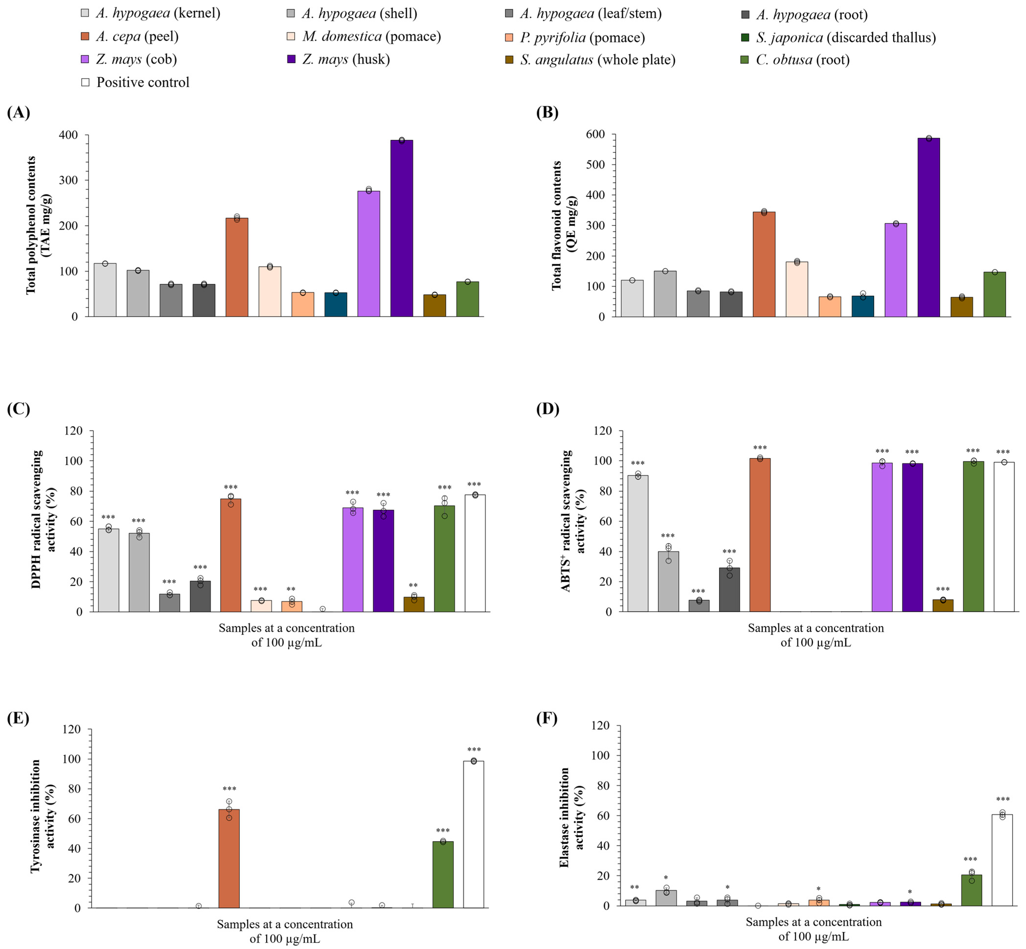 Prior to the evaluation of the biofunctional activities of the NBP extracts, preliminary phytochemical analysis was conducted. The results showed that A. cepa (peel), Z. mays (cob), and Z. mays (husk) contained relatively high levels of total polyphenols and flavonoids (Figure 2A,B). Subsequently, NBP extracts were diluted to a final concentration of 100 μg/mL and comparatively evaluated for their antioxidant, tyrosinase inhibition, and elastase inhibition activities. NBP extracts were diluted to a final concentration of 100 μg/mL and comparatively evaluated for their antioxidant, tyrosinase inhibition, and elastase inhibition activities. All extracts and the positive control were treated at a final concentration of 100 µg/mL, a condition widely used in previous studies for initial screening of natural product bioactivity [27,28]. Comprehensive assessment of DPPH and ABTS+ radical-scavenging activities revealed that A. cepa (peel), Z. mays (cob), Z. mays (husk), and C. obtusa (root) exhibited the highest antioxidant capacities, while A. hypogaea (kernel) and A. hypogaea (shell) showed the second highest activity (Figure 2C,D). BHA was used as a positive control, as it is a well-established phenolic antioxidant with clearly demonstrated efficacy. Moreover, BHA exhibits high reproducibility and stability in chemical antioxidant assays, making it a suitable reference compound for the present study [29]. Tyrosinase inhibition activity was assessed via a mushroom tyrosinase inhibition assay, with A. cepa (peel) demonstrating the strongest inhibitory effect, followed by C. obtusa (root), whereas the remaining extracts exhibited negligible activity (Figure 2E). Elastase inhibition activity was evaluated through an elastase inhibition assay, and C. obtusa (root) displayed the strongest inhibitory effect, followed by A. hypogaea (shell), while the other extracts showed no significant inhibition (Figure 2F).