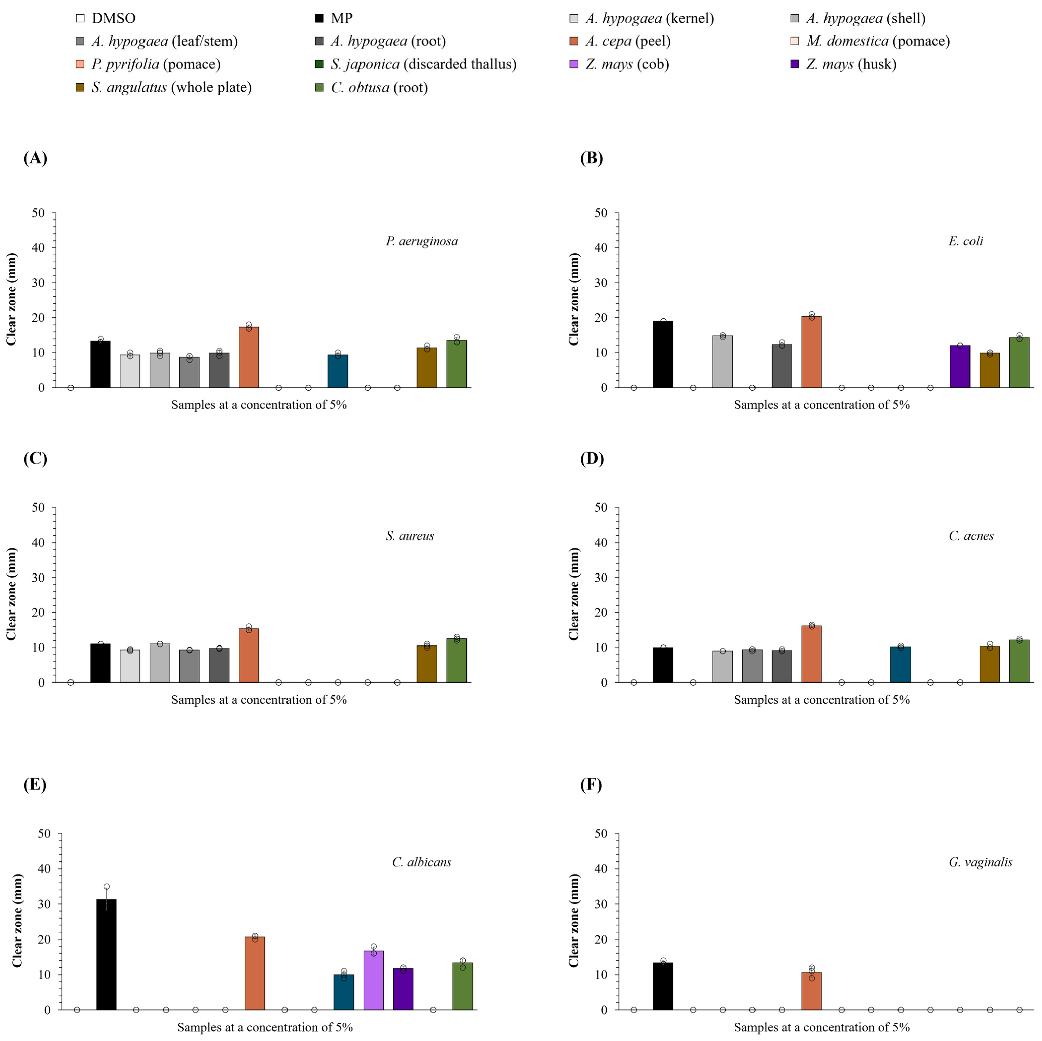 The antimicrobial efficacy of NBPs against six microorganisms associated with skin diseases and inflammation was evaluated using the paper disk diffusion method. Each extract was applied at a 5% concentration, and the diameter of the inhibition zones (clear zones) was measured (Figure 3 and Figure 4). Among the extracts, A. cepa (peel) exhibited the strongest activity against all six tested strains. C. obtusa (root) showed clear inhibition against five strains, excluding G. vaginalis. A. hypogaea (shell and root) inhibited four strains, excluding G. vaginalis and C. albicans. S. angulatus (whole plant) demonstrated antimicrobial effects against all strains except E. coli, C. albicans, and G. vaginalis.