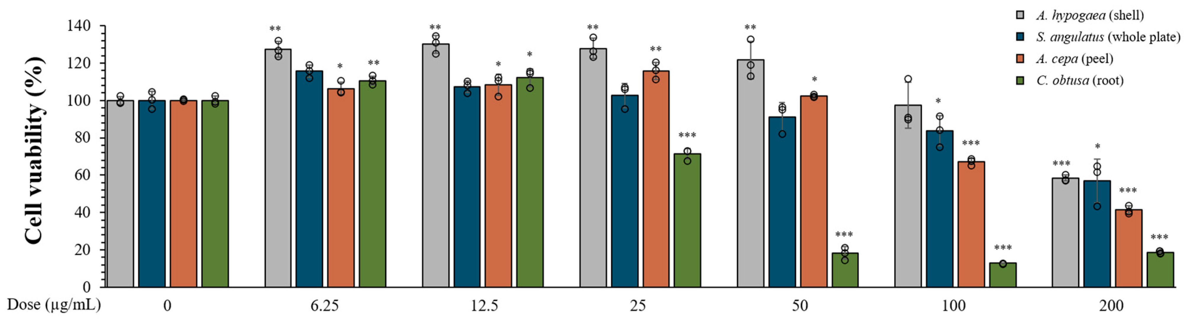 Figure 7. Cytotoxicity of Four Selected NBPs in RAW 264.7 Cells. RAW 264.7 cell were seeded in 96 well plates and treated with A. hypogaea (shell), S. angulatus (whole plant), A. cepa (peel), and C. obtusa (root) for 24 h. Cell viability was determined by MTT assay. All statistical analyses were conducted with Microsoft Excel software. Data represents the mean ± SD, n = 3. * p < 0.05, ** p < 0.01, *** p < 0.001 in comparison to non-treated groups. Each circle represents an individual data point from independent samples.