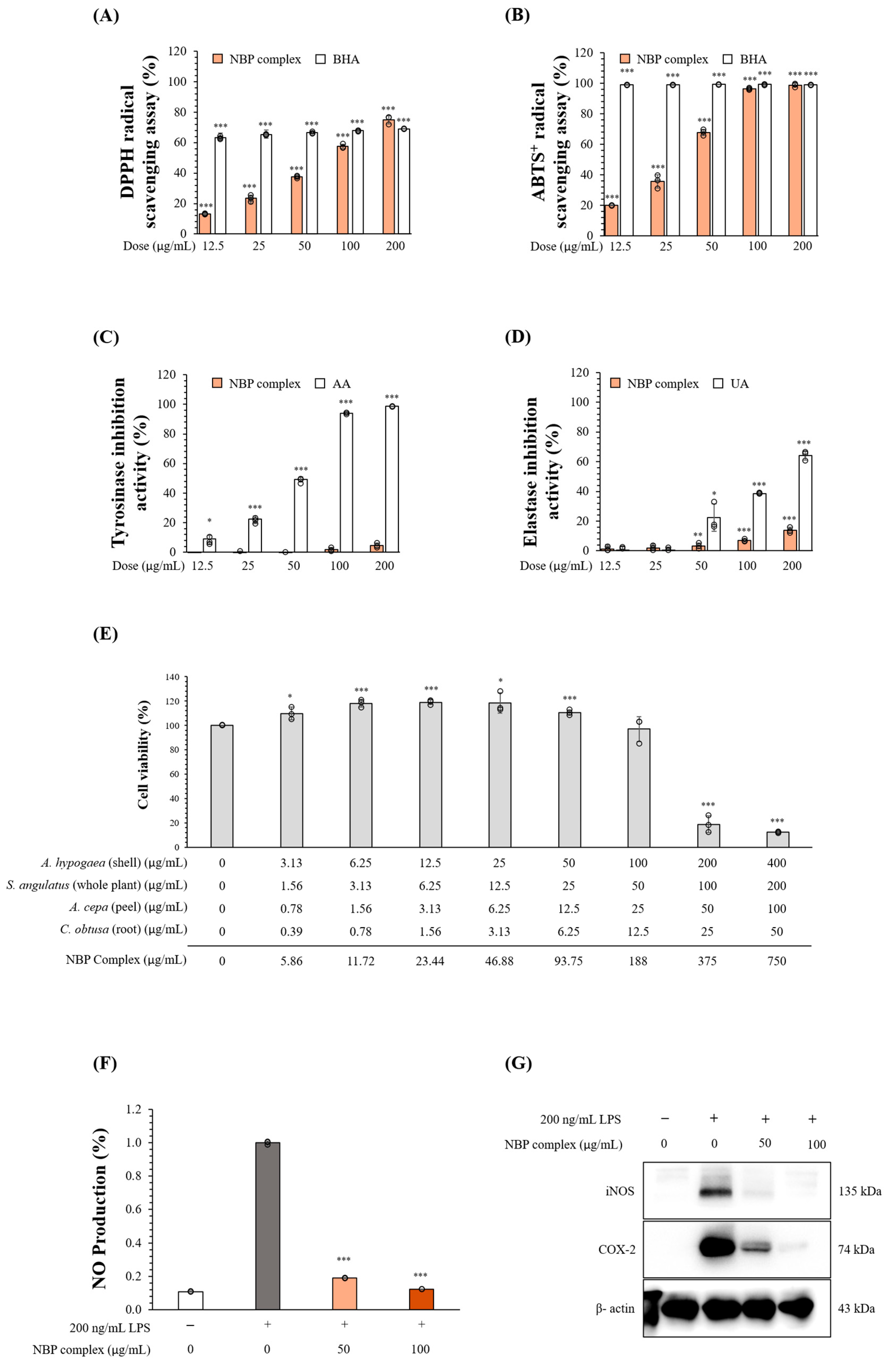 Figure 8. In vitro Activities of NBP Complex. The NBP complex, composed of A. hypogaea (shell), S. angulatus (whole plant), A. cepa (peel), and C. obtusa (root), was evaluated for its diverse functional properties at in vitro. (A): DPPH radical scavenging activity. (B): ABTS+ radical scavenging activity. (C): Mushroom tyrosinase inhibitory activity. (D): Elastase inhibition activity. (E): Cell viability in RAW 264.7 cells following 24 h treatment with the NBP complex. (F): Inhibitory effects on NO production in LPS-stimulated RAW 264.7 cells, assessed using the Griess reagent assay. (G): Effects on iNOS and COX-2 expression in LPS-stimulated RAW 264.7 cells. The complete Western blot images are provided in Figure S1. RAW 264.7 cells were pretreated with the NBP complex for 2 h prior to LPS stimulation and subsequently incubated for an additional 16 h (F,G). All statistical analyses were conducted with Microsoft Excel software. Data represents the mean ± SD, n = 3. * p < 0.05, ** p < 0.01, *** p < 0.001 compared with untreated control or LPS-only group. Each circle represents an individual data point from independent samples.