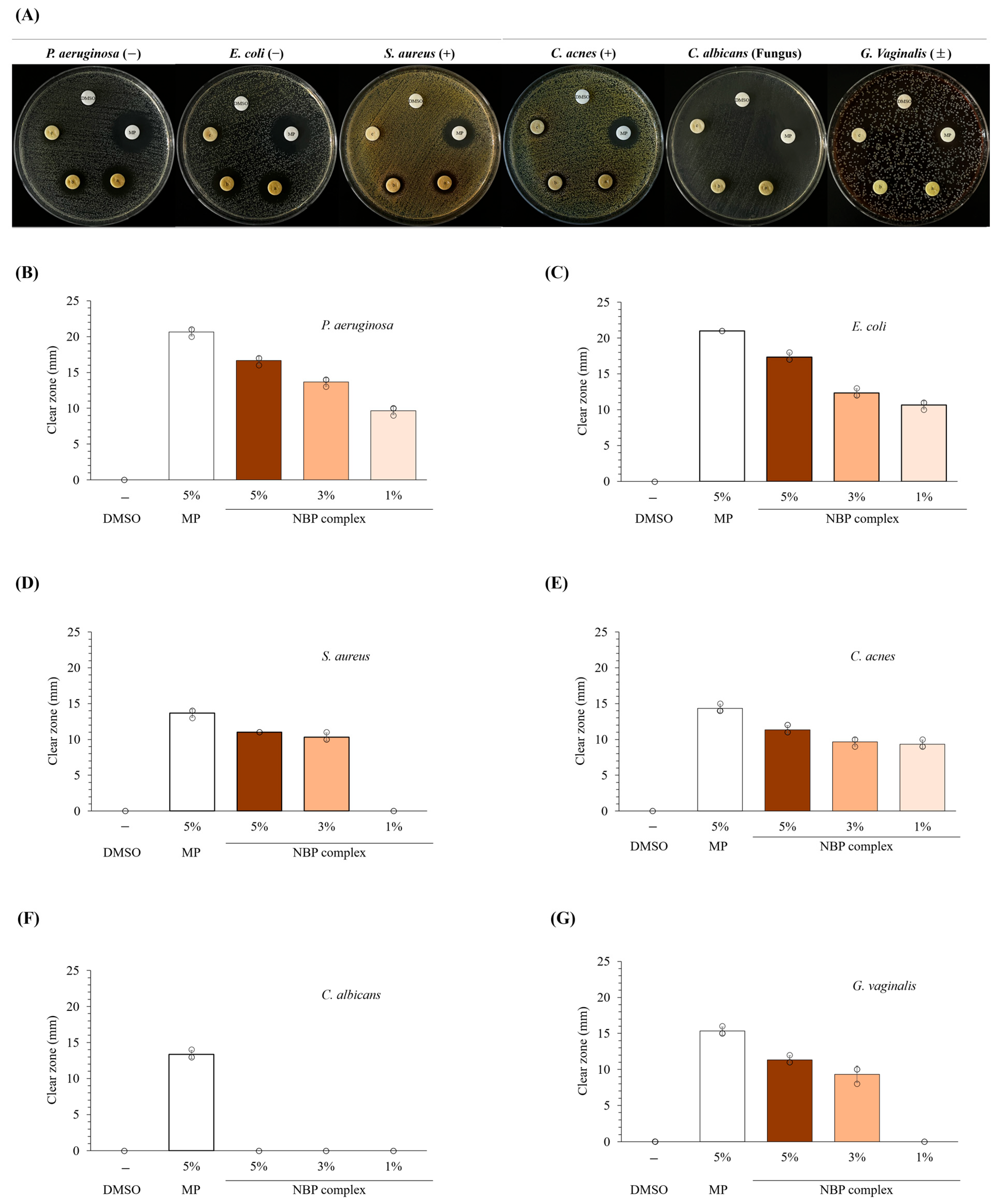 Figure 9. Antimicrobial Activity of NBP Complex. (A) Representative images of inhibition zones on agar plates. Positive control: methyl paraben (MP), negative control: dimethyl sulfoxide (DMSO). Paper disk size: 8 mm. a: 5% of NBP complex, b: 3% of NBP complex, c: 1% of NBP complex. (B) P. aeruginosa; (C) E. coli; (D) S. aureus; (E) C. acnes; (F) C. albicans; (G) G. vaginalis. All statistical analyses were conducted with Microsoft Excel software. Data represents the mean ± SD. Each circle represents an individual data point from independent samples.