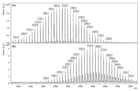 The numerical average molecular mass (Mn) and the gravimetric average molecular mass (Mw) were calculated based on the MALDI MS spectra according to Equations (1) and (2):