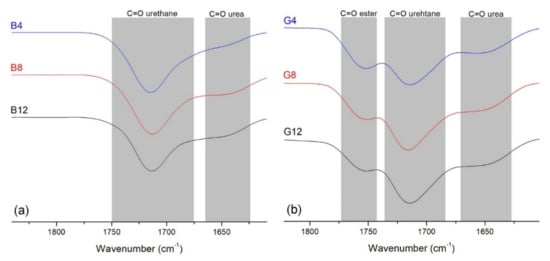 As a specific feature of the G series, the presence of the band associated with the ester C=O bond (1730 cm−1) in oligolactide, is visible in Figure 3. The overlapped spectra (see also Figure S2), demonstrate that the amount of carbonyl groups from ester functions (the band at 1750 cm−1) decreased from the G4 to G12 samples; this signifies that the oligolactide amount in each sample is proportional to the amount of CDLA added in the reaction feed.